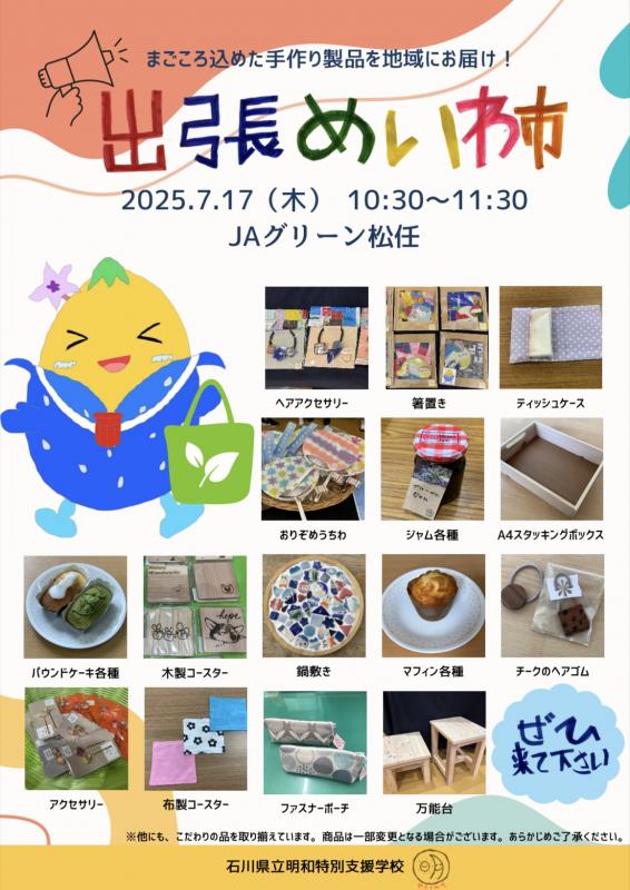 さて、本校では高等部の作業学習成果発表として、7月17日木曜日に『第1回出張めいわ市』を開催いたします。当日は、JAグリーン松任(白山市倉光4-40)において、知的障害教育部門高等部生徒数名が販売を行います。詳細につきましては下記のポスターをご確認ください。皆様のご来店をお待ちしています。