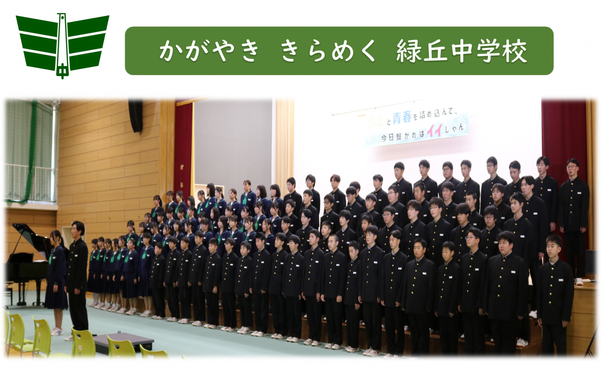 本校の校歌に「渡り鳥の誠と知恵を 身につけて 我らも行かん」とあるように、「知・徳・体」を身につけて着実に前進する「 かがやき きらめく 緑丘中学校 」となるよう、全教職員と生徒全員が心をひとつにして、教育活動に邁進していく覚悟です。保護者の皆様、地域の皆様、どうか本校の教育活動に、温かいご理解とご協力を賜りますようお願い申し上げます。