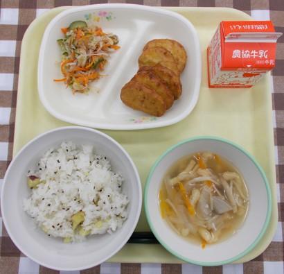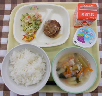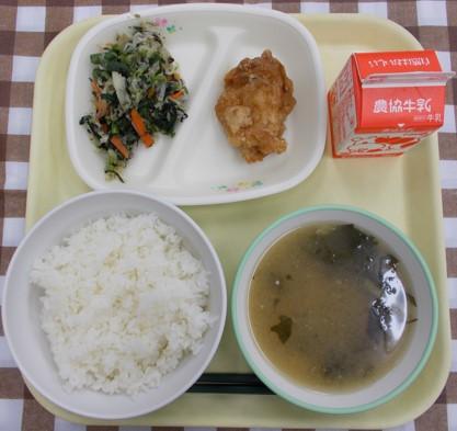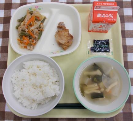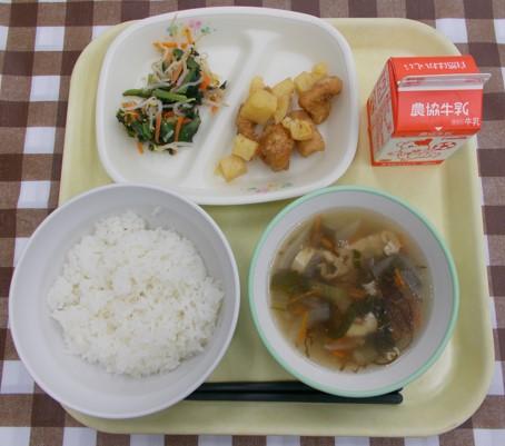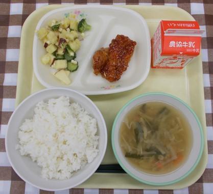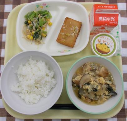 白ごはん、鶏肉とれんこんの揚げ煮、かきたま汁、メロンゼリー、牛乳