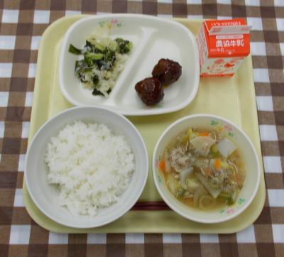 ごはん、肉団子、ごまじゃこサラダ、豚汁、牛乳