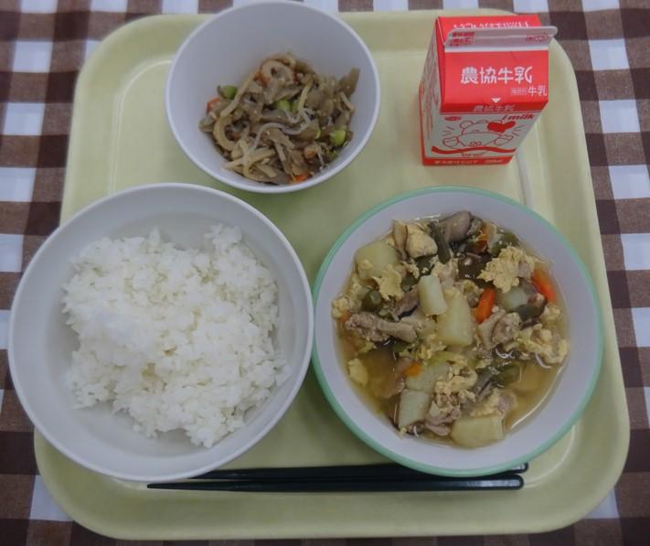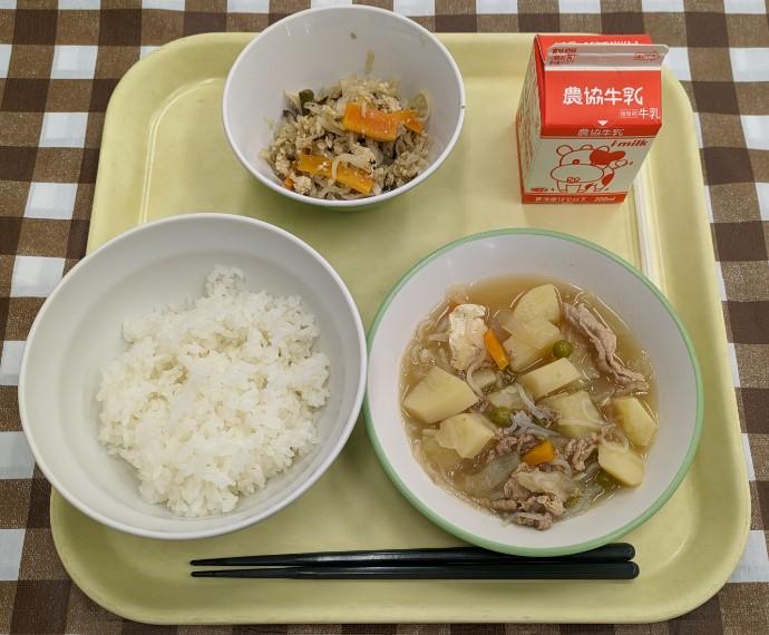 ごはん、きんぴらごぼう、高野豆腐煮、牛乳