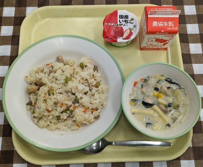 チキンピラフ、マカロニと白菜のクリーム煮、いちごのゼリー、牛乳