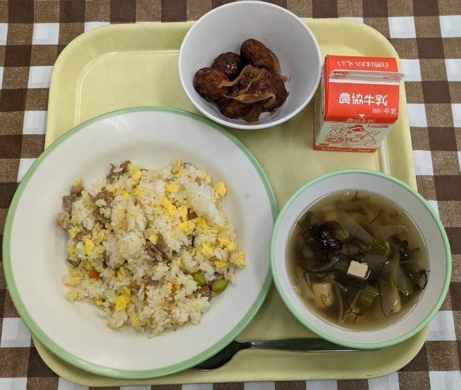 チキンカレーピラフ、ひじきのサラダ、ウインナーと野菜のスープ、牛乳