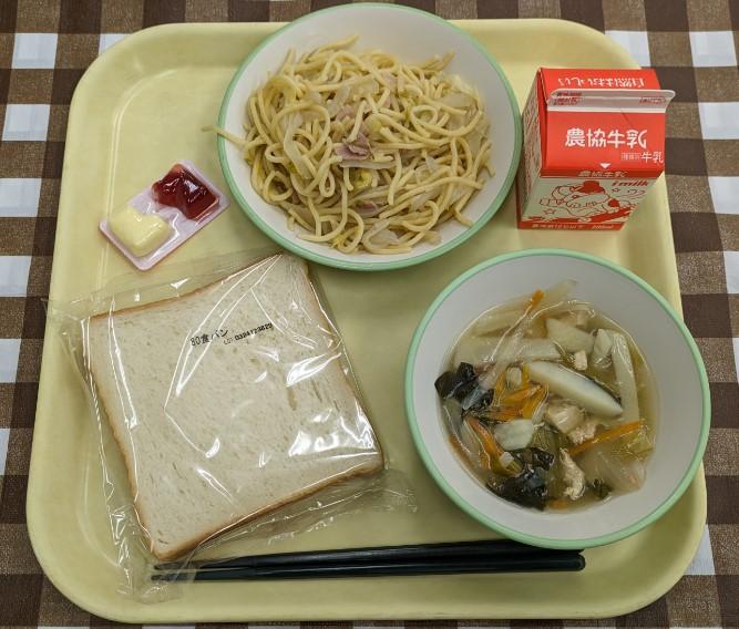 コッペパン、焼きそば、コンソメスープ、牛乳