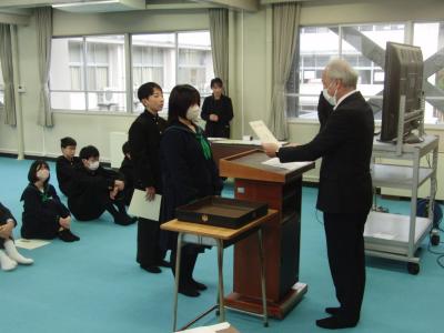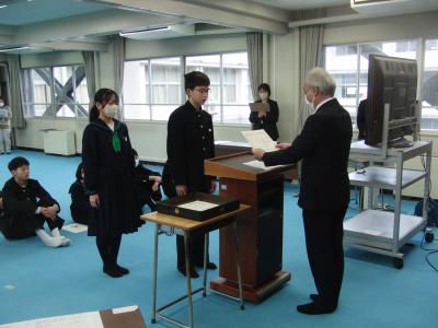 夏休みの課題として作成・出品した作品の入賞報告が次々と届きました。市や能登レベルの入賞・優勝に加え、県知事賞や県の金賞、入賞も多数あり、それぞれ代表が納賞したり表彰を受けたりしました。また、2学期中に取得した英語検定や漢字検定・数学検定等の合格証も手渡されました。