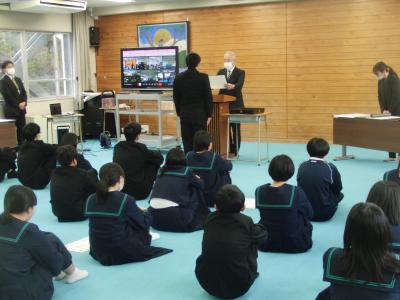 2年生は、職場体験活動を通して見つけた、市内企業の取組を紹介しました。