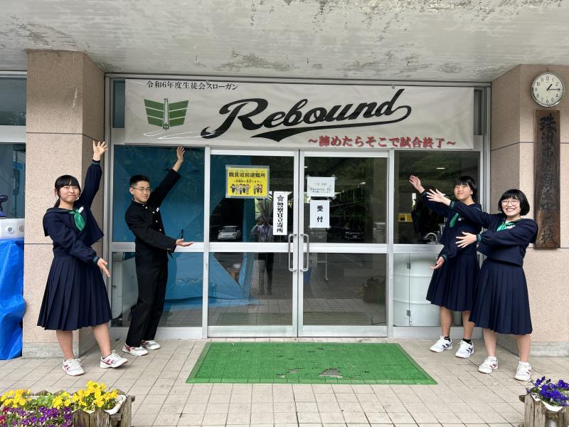 5月7日(火)、生徒会執行部は今年度の生徒会スローガンを生徒玄関に設置する作業を行いました。