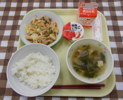 ごはん、豚肉と厚揚げのみそ炒め、すまし汁、いちごゼリー、牛乳