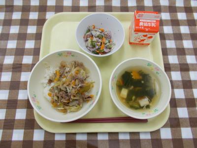 今日は牛丼でした。給食の牛丼は牛肉以外にも玉ねぎ、しらたき、えのき、