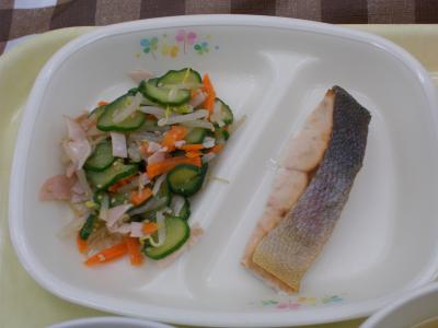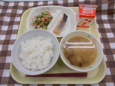 ごはん、鮭の塩焼き、きゅうりの和え物、なめこ汁、牛乳