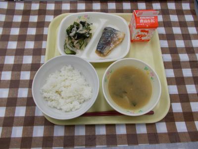 ごはん、さばのみそ煮、和風サラダ、みそ汁、牛乳