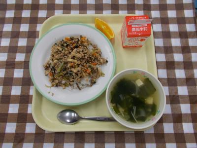 ビビンバ、わかめスープ、オレンジ、牛乳