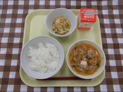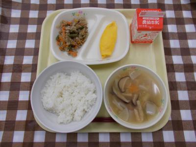 ごはん、オムレツ、きんぴらごぼう、のっぺい汁、牛乳