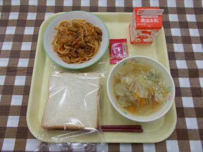 食パン、いちごジャム、ミートスパゲティ、コンソメスープ、牛乳