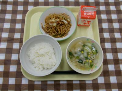 少なめごはん、焼きそば、ワンタンスープ、牛乳