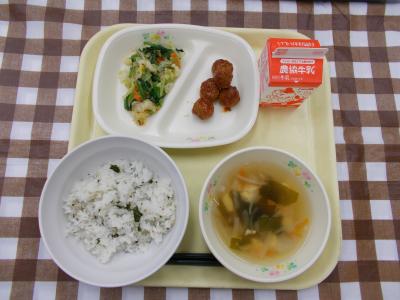 わかめごはん、ミートボールのケチャップ和え、おかか和え、すまし汁、牛乳