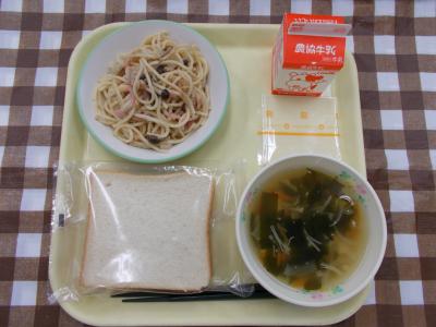 食パン、スライスチーズ、ツナの和風スパゲティ、わかめスープ、牛乳