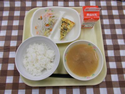 ごはん、スパニッシュオムレツ、春雨サラダ、みそ汁、牛乳