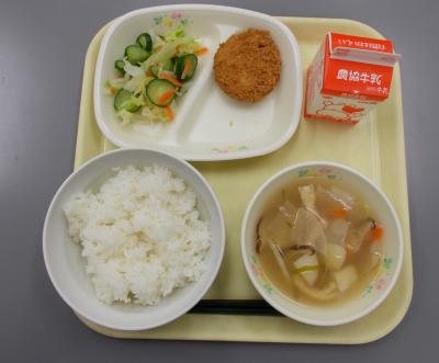 ごはん、メンチカツ、あっさり漬け、のっぺい汁、牛乳