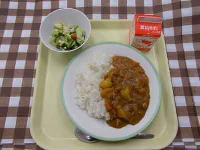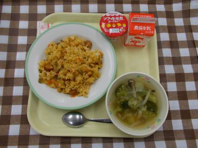 ジャンバラヤ、野菜スープ、ヨーグルト、牛乳