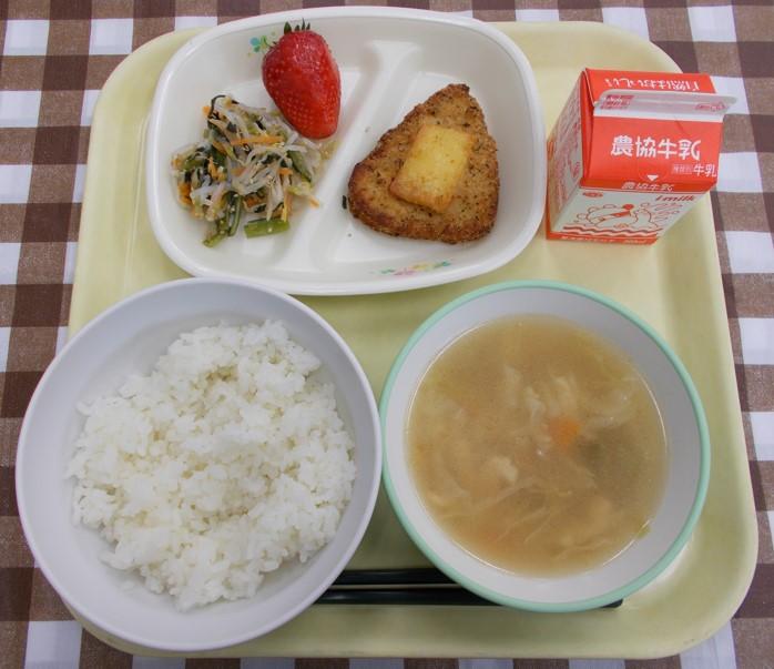 白ごはん、魚のフライ、ごぼうサラダ、オニオンスープ、牛乳