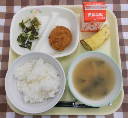 ごはん、メンチカツ、キャベツとちくわのみそ和え、みそ汁、