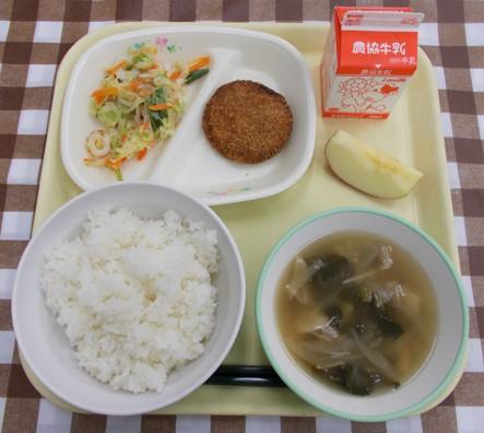 ごはん、メンチカツ、キャベツとちくわのみそ和え、みそ汁、