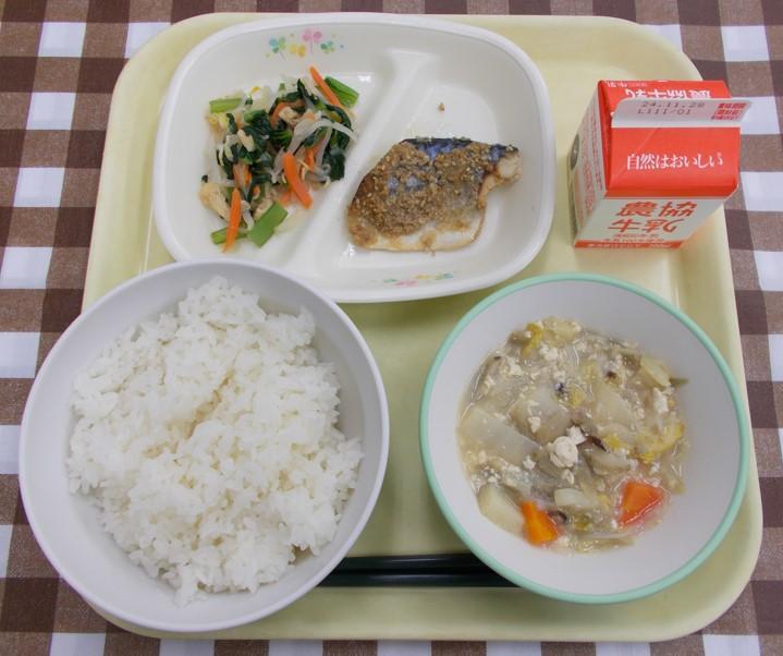 ごはん、さばのごまみそ焼き、青菜の和えもの、みそけんちん、牛乳