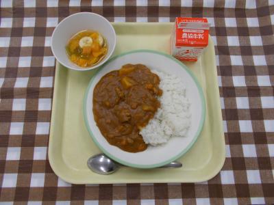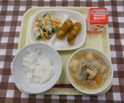 ごはん、ちくわのカレー揚げ、あっさり漬け、肉じゃが、牛乳