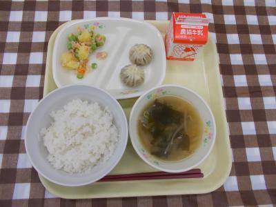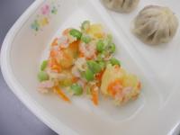 ごはん、パオズ、じゃがいもと枝豆のコクうま和え、みそ汁、牛