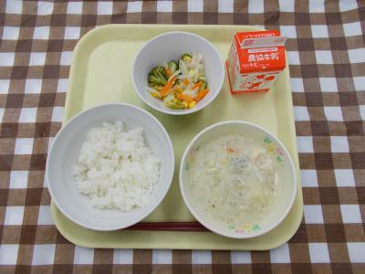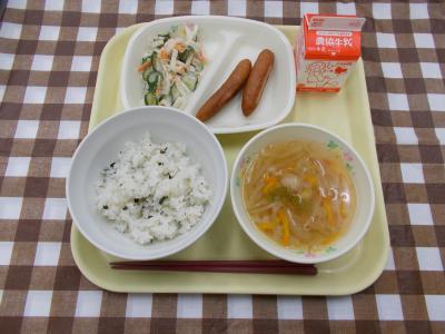 わかめごはん、ボイルウインナー、シーチキンサラダ、野菜スープ、牛乳