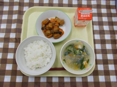 ごはん、ミートボールの酢豚風、春雨スープ、牛乳