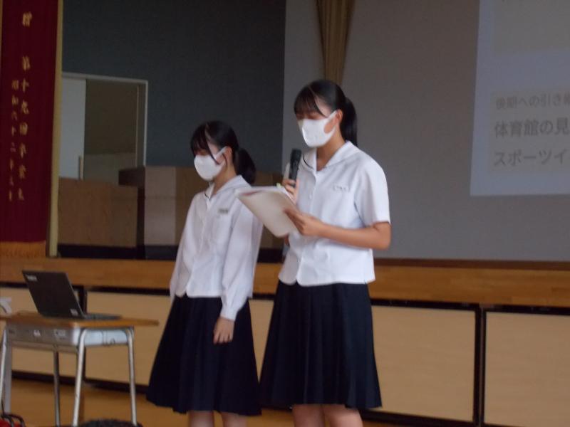 生徒集会では、各委員会から、前期の振り返りを踏まえた目標や文化祭に向けた役割分担などの発表があり、その後、執行部から文化祭を行う上で大切にしたいことや活動期間の話などがありました。