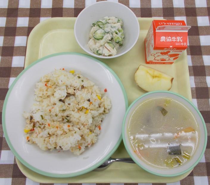 ピラフ、ポテトサラダ、スープ、りんご、牛乳