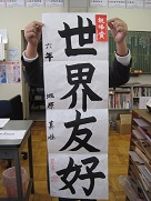 職員室に6年生が日本習字教育財団の観峰賞受賞の喜びを伝えに来ました。
