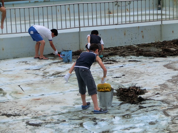 今日プール掃除をしました。午前中の34限目に56年生の体育として児童だけで行い、午後は保護者と地域の方10名と3~6年生18名並びに職員で行いました。午前中に児童たちが頑張ってくれたおかげで、午後の作業では保護者や地域の方が掃除がしやすいと喜んでいました。そして、高学年の頼もしさを実感していました。とにかく、保護者や地域の方のおかげで大きなプールが大変綺麗になりました。ありがとうございました。