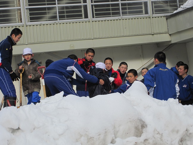 航空学園高校の野球部の監督やコーチ、部員総勢38名が雪すかしにきてくれました。おかげで非常階段からの通路や外から体育館に入る通路が確保できました。せっかくの機会だったので、作業に入る前に小学生とドッチボールや手つなぎ鬼などを通して交流を深めました。小学生はもちろん、高校生もとても楽しそうにゲームに参加していました。