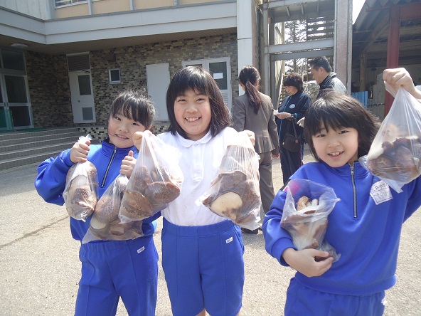給食を食べ終えた昼休みに、椎茸の菌入れ作業と椎茸を取りに行きました。子どもたちは一人一本の木を割り当てられ、各自で菌入れを行いました。中には慣れた手つきで早々と作業を終える子や、低学年の世話をする高学年の姿が見られ、短時間でしたが、天気も良く楽しみながら菌入れの作業や収穫を楽しむことが出来ました。