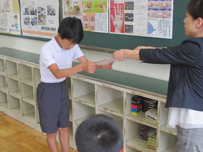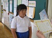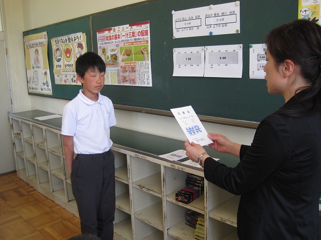 給食後に「進んで挨拶ができたでしょう」の表彰式をおこないました。小さい賞状でしたが、みんなとても喜んでいました。