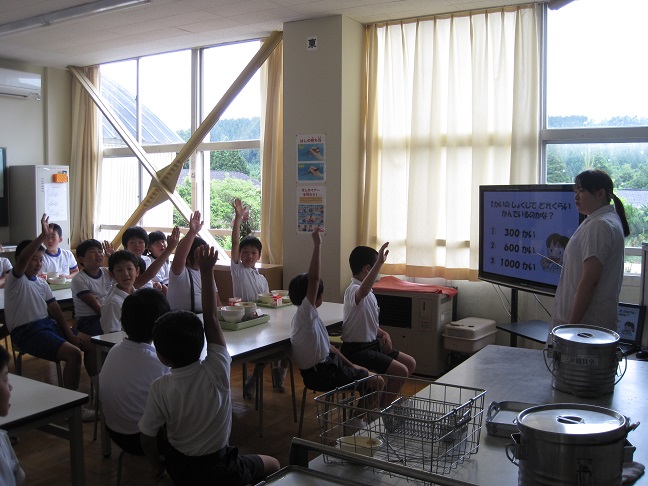 今日は栄養教諭の先生が食育指導をしてくださいました。給食の準備の仕方から、食べるときの良い姿勢、よく噛むことのメリットなどたくさんのことを教わりました。今日学んだことを学校だけでなく、お家やお店などでも実践できるといいですね