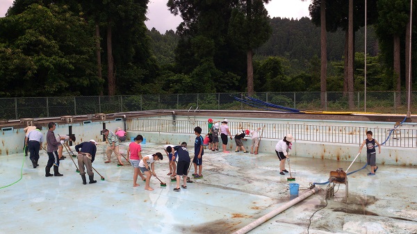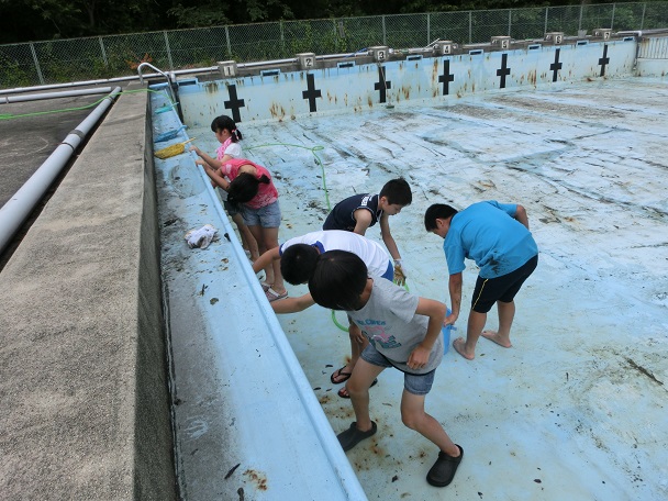 今日プール掃除をしました。午前中の34限目に56年生の体育として児童だけで行い、午後は保護者と地域の方10名と3~6年生18名並びに職員で行いました。午前中に児童たちが頑張ってくれたおかげで、午後の作業では保護者や地域の方が掃除がしやすいと喜んでいました。そして、高学年の頼もしさを実感していました。とにかく、保護者や地域の方のおかげで大きなプールが大変綺麗になりました。ありがとうございました。