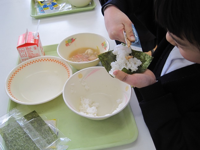 今日の給食を子どもたちは楽しみにしていました。節分給食として手巻き寿司があったからです。のりは5枚で納豆、かまぼこ、ウインナー、キュ-ーリ、漬け物の5品をのりにご飯と具を一つずつのせて手巻き寿司をつくって食べていました。みな手巻きをつくるのに一生懸命で、出来上がったらすぐにおいしそうに食べていました。