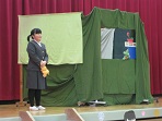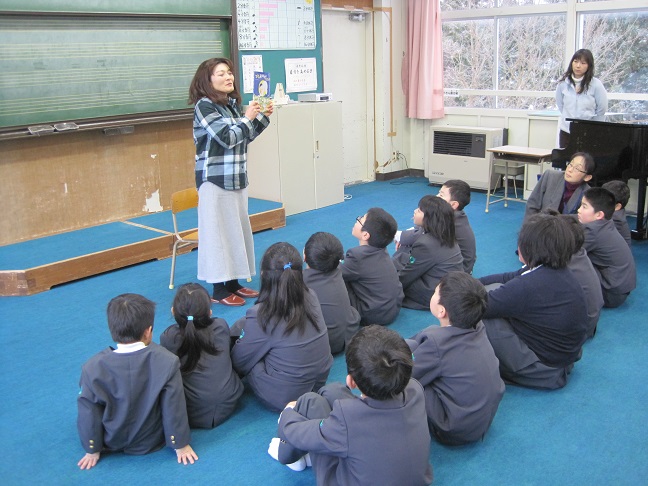 今日は月一回の読み聞かせの日でした。ボランティアの山下さんに「雪だるまのボタン」と「ほねの話」の紙芝居をして頂きました。二つの話とも子どもたちは興味を持って一生懸命に聞いていました。後の感想でも2人が自主的に手を上げて感想を話していました。