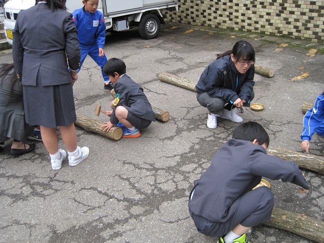 昼休みに全学年で椎茸の菌入れをしました。2年生から6年生までは慣れた手つきで菌をどんどんと打ち込んでいました。1年生はその様子を見ながらおそるおそる木槌で菌を打ち、一つ打ち込むごとに喜んでいました。その後、みんなで椎茸取りを楽しんでいました。