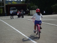7日の5限目に学校の駐車場を使って、警察の方の協力で低学年は道路の歩き方と横断歩道の渡り方、中高学年は自転車乗りの練習をしました。