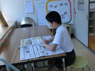 今まで玄関にあった子ども新聞のコーナーを二階ランチルームの前に移しました。広々としたスペースでゆっくり座って読むことができ、今、人気の場所になっています。