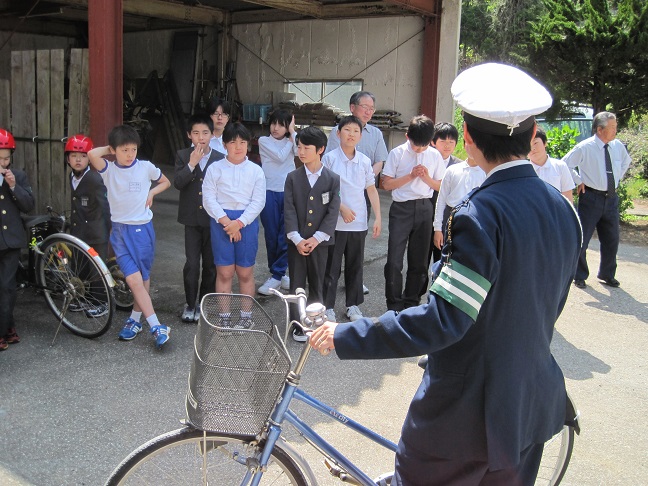26日の5限目におまわりさんに来ていただいて交通安全教室をしました。学校前の広場で道路や交差点、横断歩道を描いて行いました。12年生は正しい横断歩道の渡り方を中心に、3~6年生は自転車の乗り方を勉強しました。おまわりさんは一人ひとりに丁寧に分かりやすく教えて頂いたので、子どもたちは交通ルールや安全な自転車の乗り方などをよく理解していました。