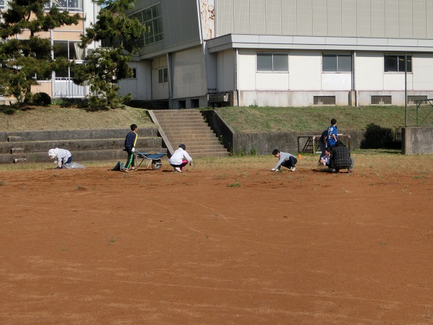 5月24日の「あての森総合運動会」に向けて学校では子どもたちは先週の水曜日から練習に入っています。今日はその運動会に向けて4・5・6年の児童と全保護者とボランティアの方で運動場の草むしりをしました。児童数からみると、とても広い運動場で大変な作業となりましたが、朝からさわやかな青空の下で、作業を通して子どもたち同士、又は地域の人とのふれあう機会ともなりました。