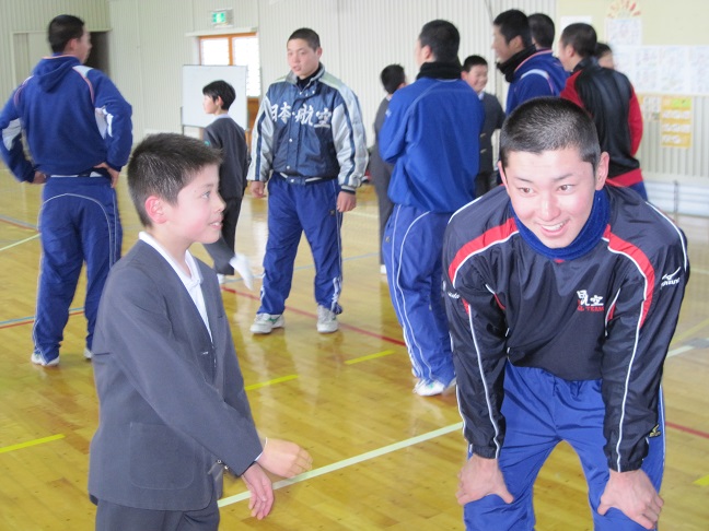 航空学園高校の野球部の監督やコーチ、部員総勢38名が雪すかしにきてくれました。おかげで非常階段からの通路や外から体育館に入る通路が確保できました。せっかくの機会だったので、作業に入る前に小学生とドッチボールや手つなぎ鬼などを通して交流を深めました。小学生はもちろん、高校生もとても楽しそうにゲームに参加していました。