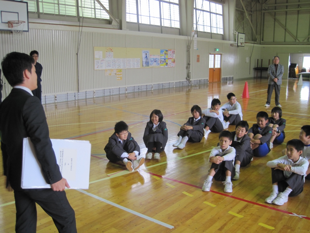3限目学校に不審者が入ってきたことを想定して、職員が対応しました。子どもたちはスムーズな避難の訓練をしました。その後全員体育館に集まり、街で声をかけられて時の対応を警察の方から学びました。